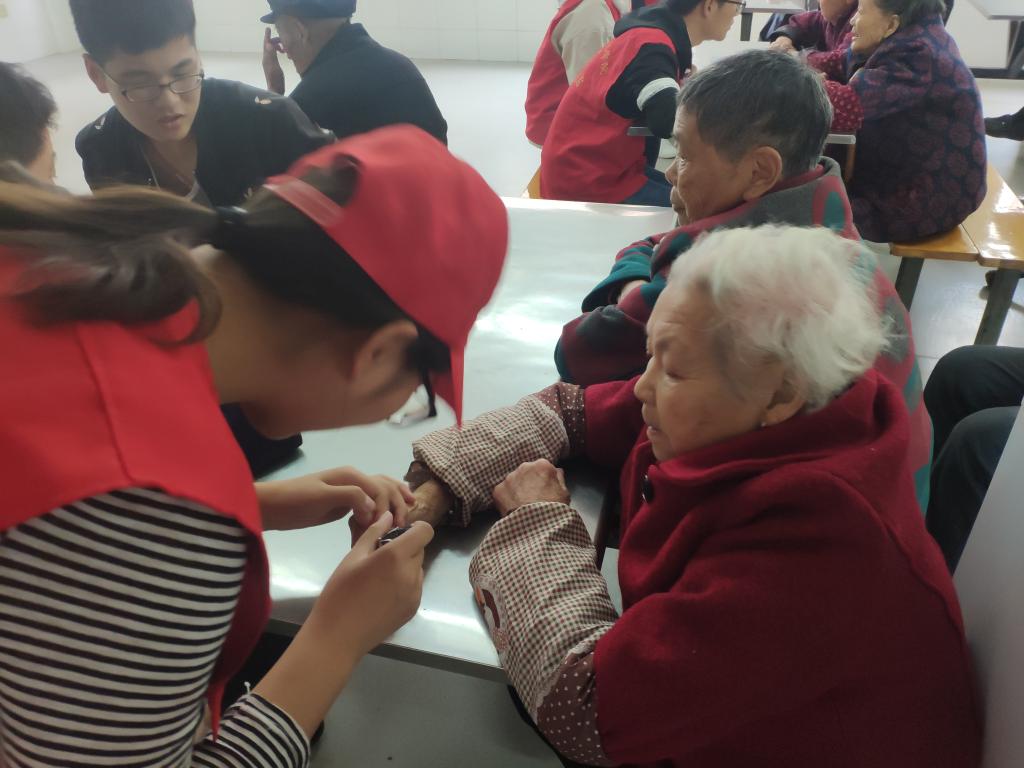 刚到敬老院,同学们纷纷行动起来。志愿者们在院方组织者和护工的指引下,按照分组开展志愿服务,在老人们住处帮助打扫卫生、整理衣物;为他们梳理头发、剪手指甲、剪脚趾甲;陪老人聊天,听他们的感情倾诉,整个下午院子里处处充满了温暖和欢声笑语。