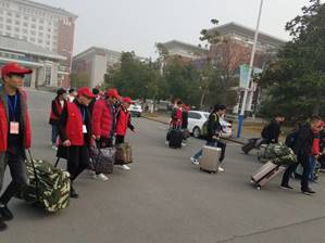 2018年11月30日金沙威尼斯欢乐娱人城汽车工程系团总支成员在校园大门口迎接学长们的归来。