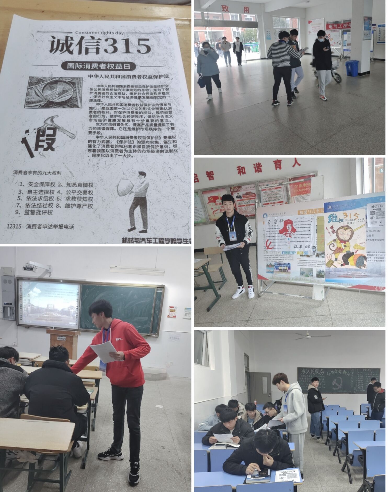 2021年3月15日上午,机械与汽车工程学院学生会权益部全体成员在5号教学楼大厅展开了“3·15消费者权益日”打假宣传活动,并向全院学生发放消费者权益宣传单,学生们积极参与其中。