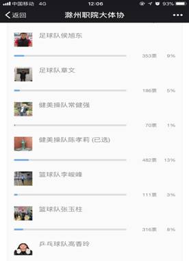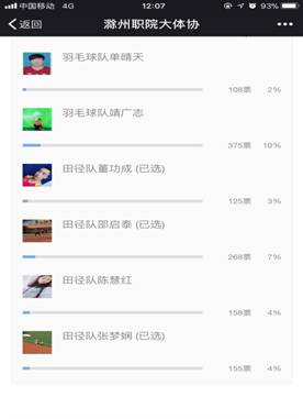 本次评选从12月初开始启动,前期对全院八支训练队推选的18名运动员及在运动会上表现突出的2名运动员共20人,体育部制作展板在运动场橱窗公示,同时把20位候选人的情况以微信图片的形式推送到学院微信公众平台,供同学们了解,特别是在微信投票环节得到了全院广大同学的广泛参与,在一个星期的投票时间段共有来自全院3688名同学参与投票。其中健美操队陈孝莉同学以482票成为本次票选的票王,一时间,这些在各条战线为学院争金夺银的运动员变成校园的小明星,成为广大同学们心目中的英雄和模仿对象。