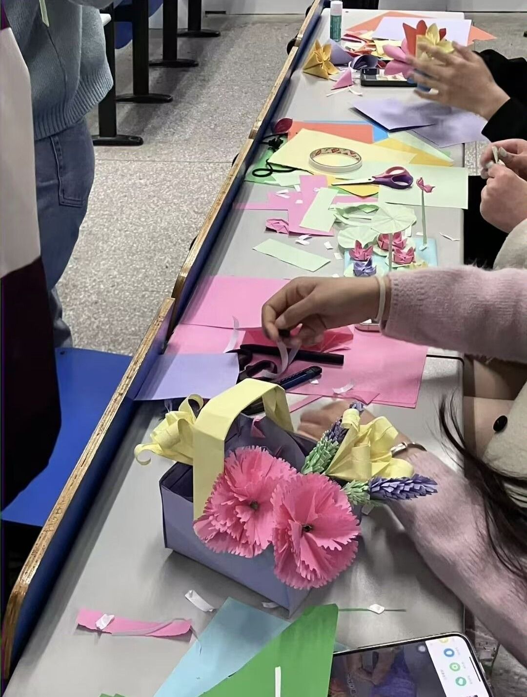 本次活动由管理学院学生会纪检部工作人员在教室门口引导学生,学生就坐后发放彩纸和剪刀。活动过程中,同学们热情高涨,纷纷发挥自己的想象力,将一张张彩纸变成了一朵朵精美的花。现场气氛热烈,同学们互相交流、切磋技艺,欢声笑语不断。这次活动不仅让同学们放松了心情,还增强了同学们对手工制作的兴趣和爱好。同时,也体现我院对学生综合素质培养的重视,为校园文化注入新的活力。
