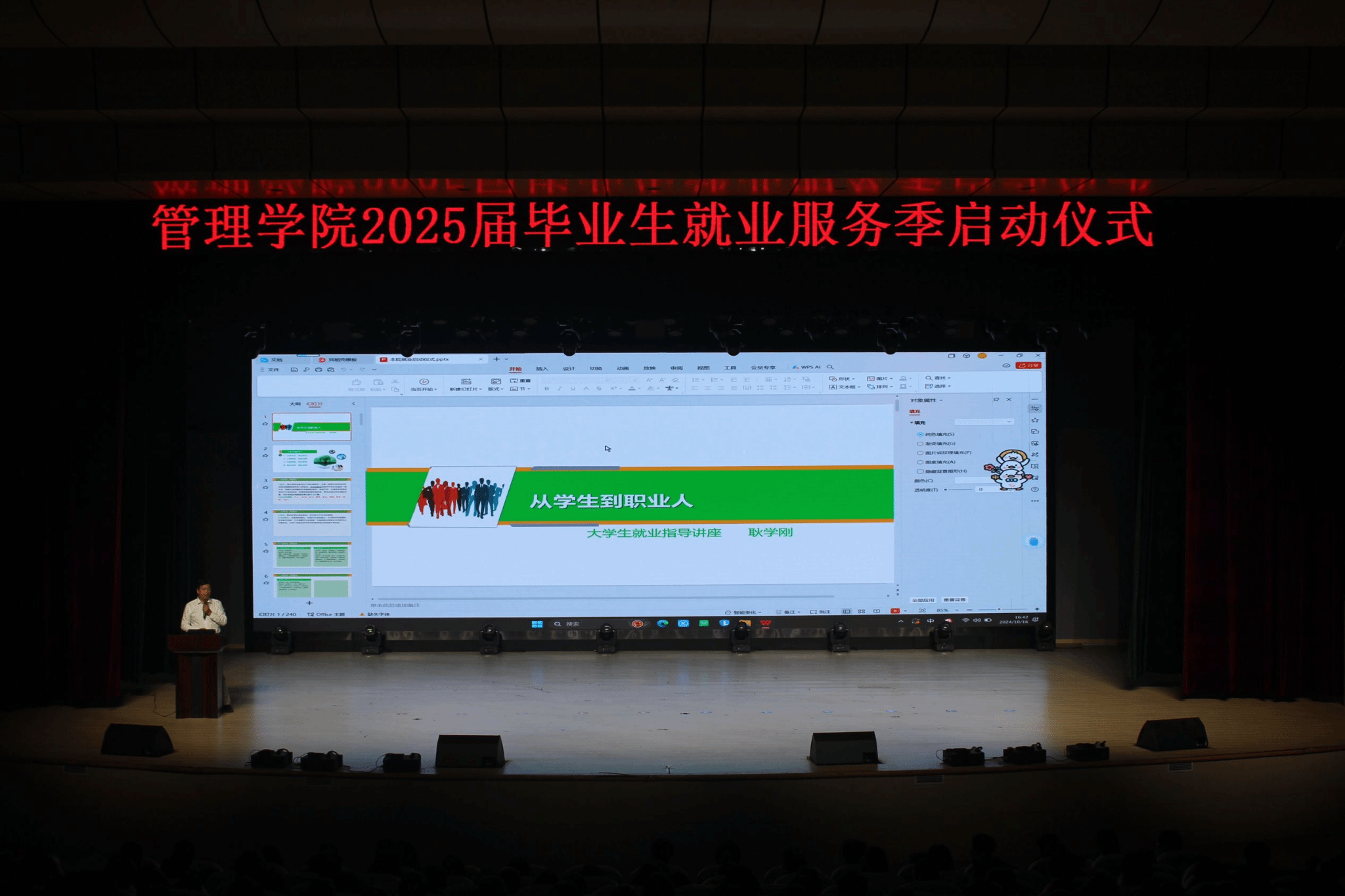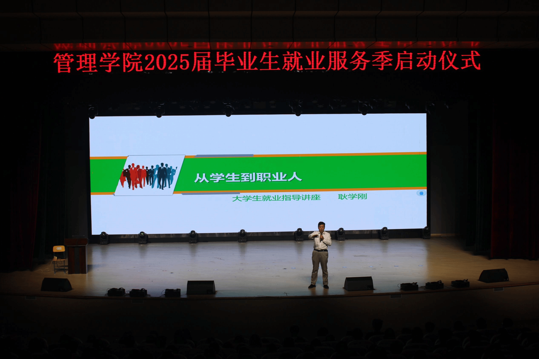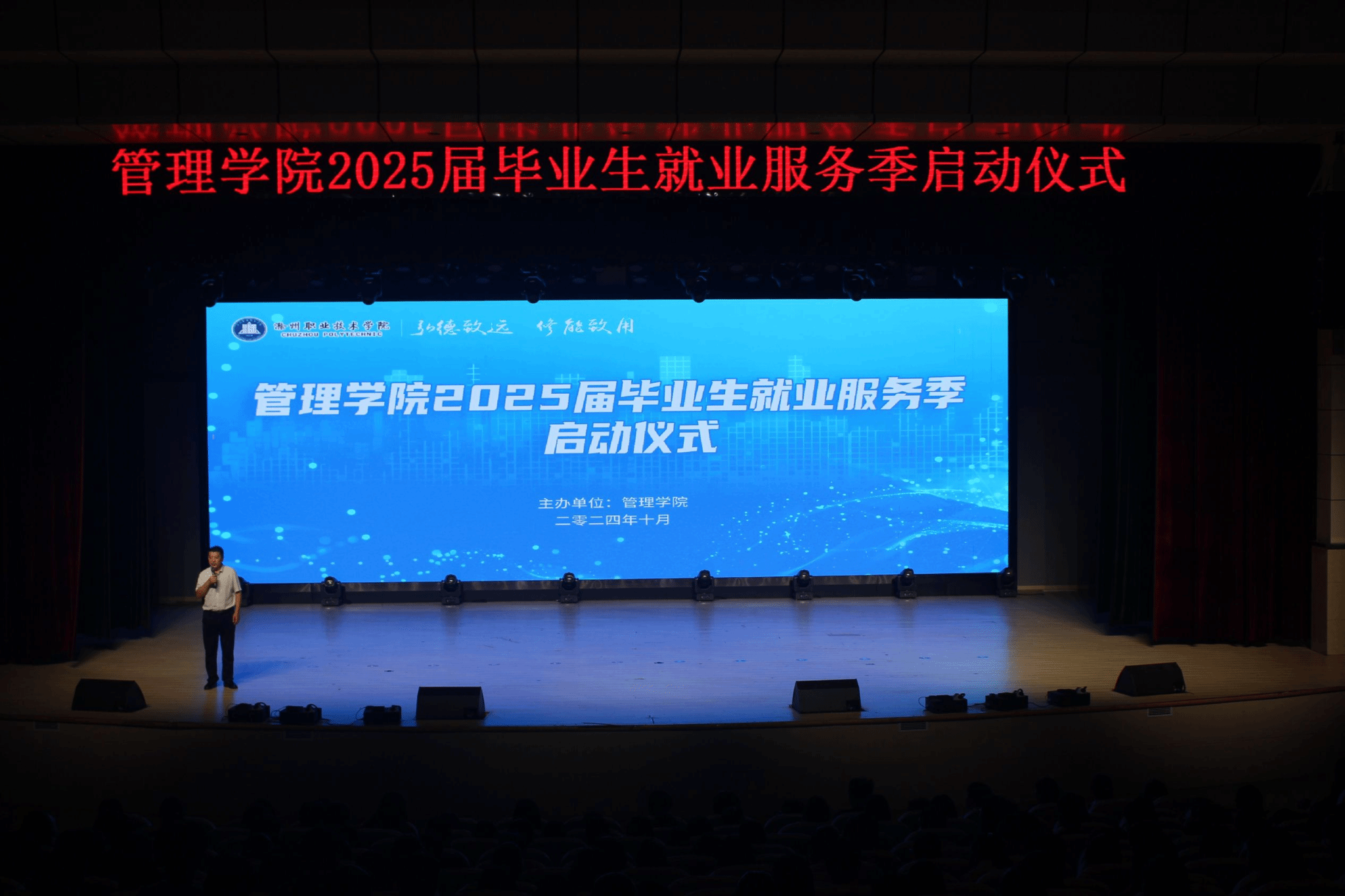 10月16日下午,管理学院在学校大礼堂开展2025届毕业生就业服务季启动仪式暨就业指导讲座。管理学院党总支书记耿学刚、招生就业处负责人王义利、管理学院副院长颜洲、党总支副书记何文婧、全体专职辅导员及管理学院2025届毕业生参会。