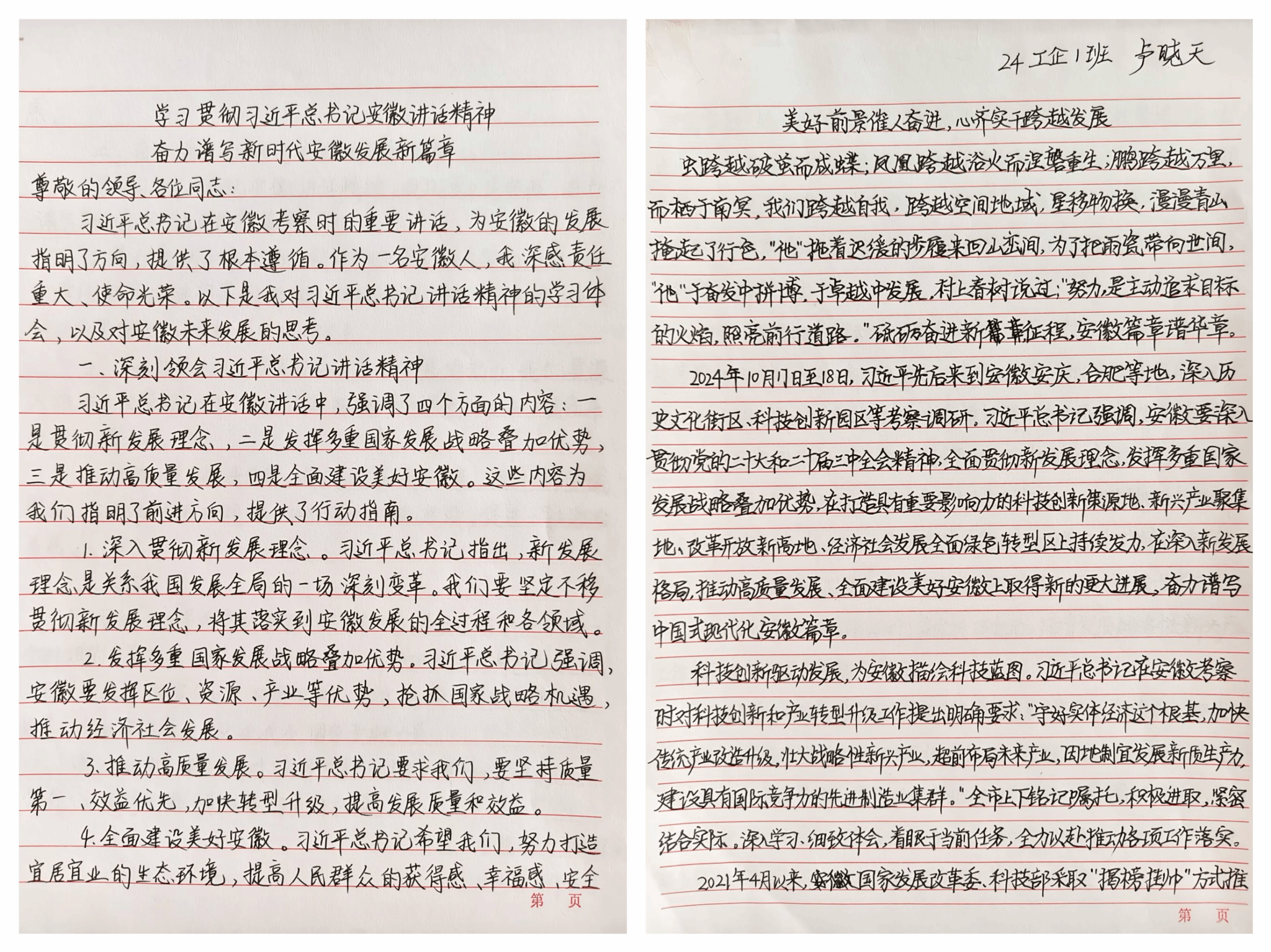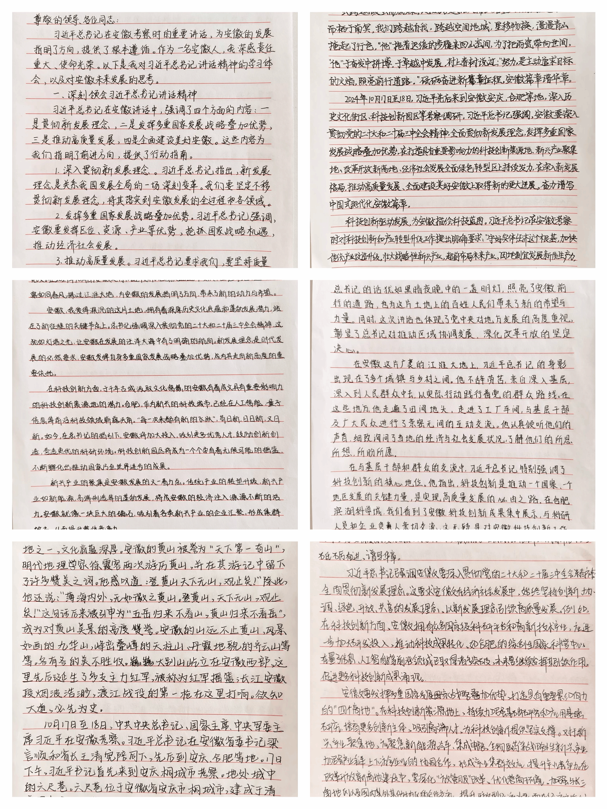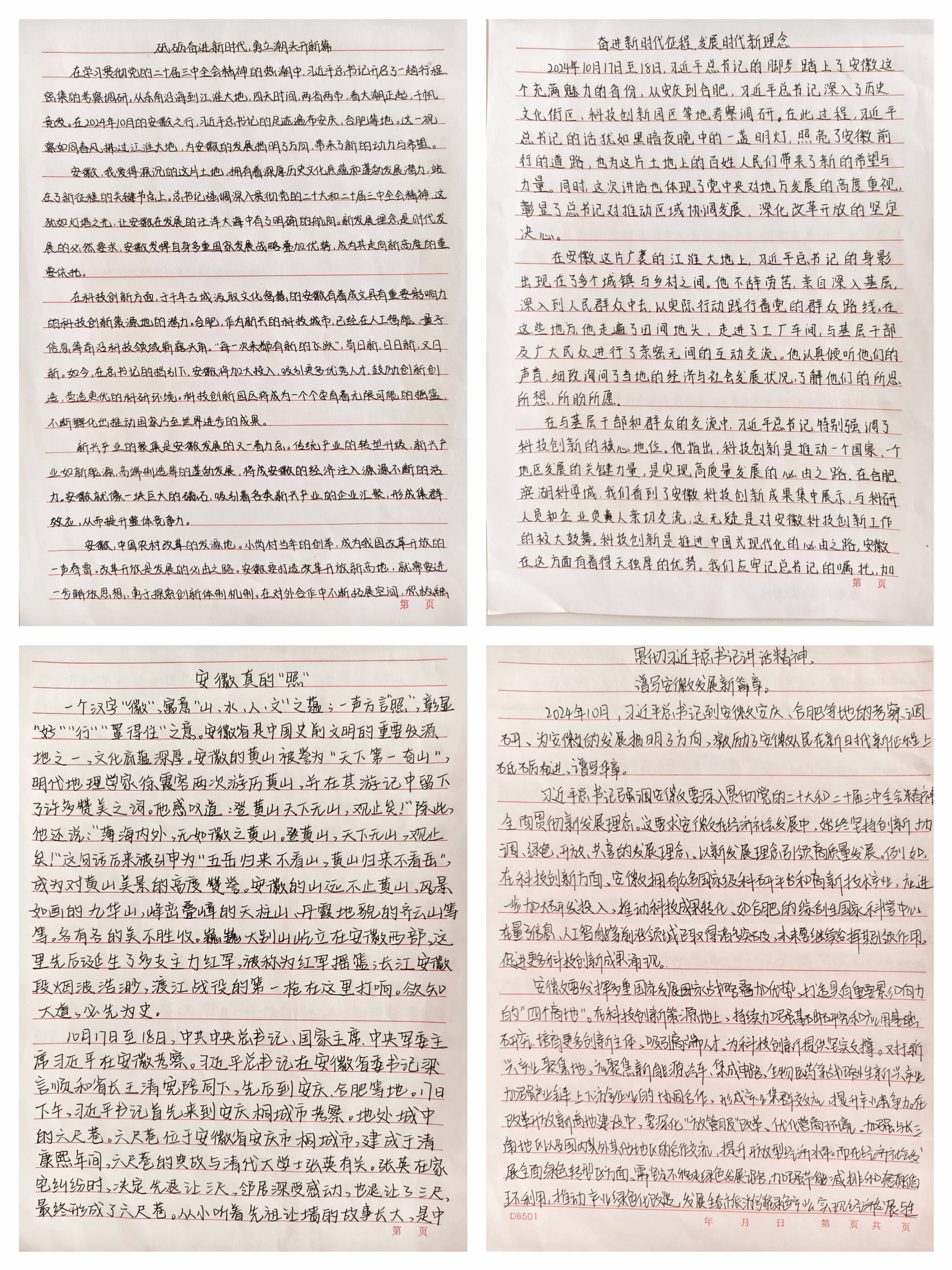 本次征文内容以习近平总书记强调的深入贯彻党的二十大和党的二十届三中全会精神为指引,充分发挥安徽多重国家发展战略叠加优势,鼓励同学们为奋力谱写中国式现代化安徽篇章贡献自己的思考与见解。同学们围绕科技创新策源地打造、新兴产业聚集、改革开放新高地建设以及经济社会绿色转型等关键方面展开深刻理解与思考。每一篇征文都凝聚着同学们对习近平总书记重要讲话精神的认真领会,展现出同学们对安徽发展的关注与期待。这些作品不仅是文字的表达,更是将个人成长与安徽发展紧密相连的生动体现。