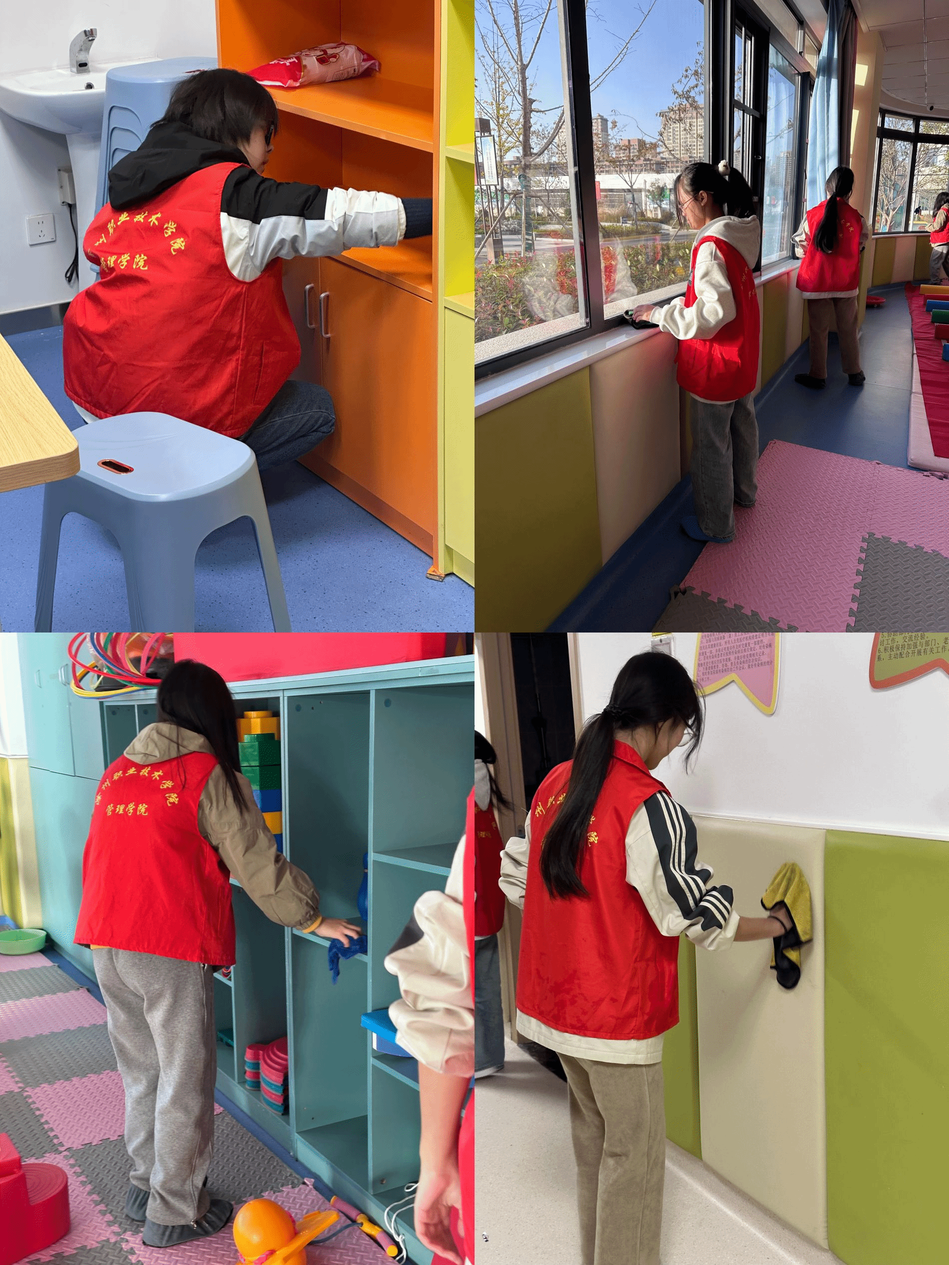 抵达医院后,志愿者们即刻投入卫生清洁工作,对儿童训练室、图书馆、病房等区域进行细致清扫,认真擦拭桌椅、清理地面杂物、整理物品摆放,力求打造一个整洁、舒心的环境,让孩子们能更好地生活与康复。