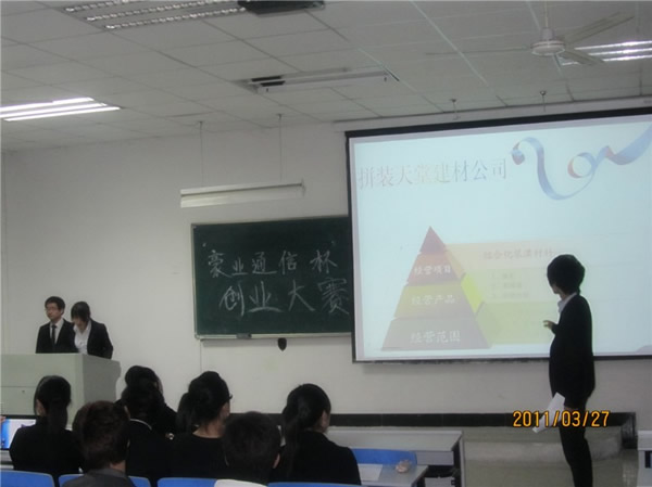 2011年3月27日下午14:00,经贸系“豪业通信杯”创业大赛的初赛选拔在经贸系教学楼1102教室举行,我系各专业的广大学生积极响应此次比赛,纷纷以组队方式积极投入其中。本次初赛由7组参赛选手进行角逐,在比赛中,他们生动的展示了各有千秋的创业理念,突显出当代大学生的新思路。本次大赛将积极推进成果转换,进行创业辅导和跟踪服务,力争促成一批青年成功创业。