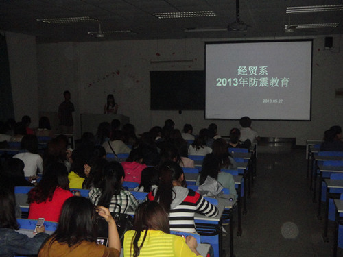 根据经济贸易系党总支的安排,2013年5月27日至29日晚经贸系团总支,学生会组织全系同学在1101教室参加了以防震安全教育为主题的的视频公开课,视频展示了地震对人们安全造成的危害和防震时科学自救及救人的方法。