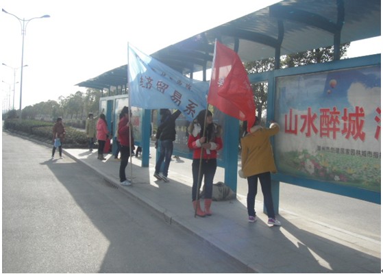 2012年12月5日,为贯彻落实党的十八大精神,深入开展学雷锋活动,经贸系组织同学参加了雷锋志愿者活动,参加本次活动志愿者们不畏寒冷的天气,都以饱满的工作热情,和乐于奉献的心态认真擦洗公交站牌,和捡绿化带圾。 通过这次学雷锋活动,志愿者们用实际行动彰显并宣传了新时代的雷锋精神,对雷锋精神有了更深刻的理解,这有利于培养同学们奉献精神和助人为乐的意识,丰富了课余生活,使同学们受益匪浅。