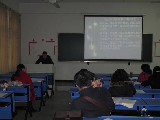 接着,金融教研室的李新乐老师又分别从课程定位、课程内容、教学重难点与解决办法、学情分析、教学方法与手段、教学组织和程序、课程考核等方面阐释了《国际金融实务》的开课情况。
