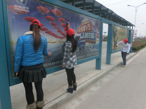 志愿者们怀着饱满的热情,带着一系列的清理工具,将站台的各个角落擦拭的一干二净,并清除了公交站台上的广告及垃圾。