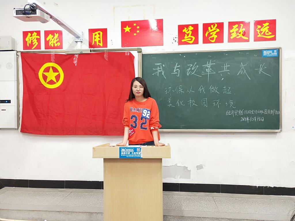 为了广泛宣传保护环境从我做起全民活动,充分展现了新时代人的良好精神风貌,引导和激励同学们充分了解保护环境的意义和深远影响。18级会计六班于10月18日19点半在经贸楼1209教室开展了“我与改革共成长,环保从我做起”主题团日活动。本次活动由团支书吴张宝主持,会计六班全体人员到场参加。