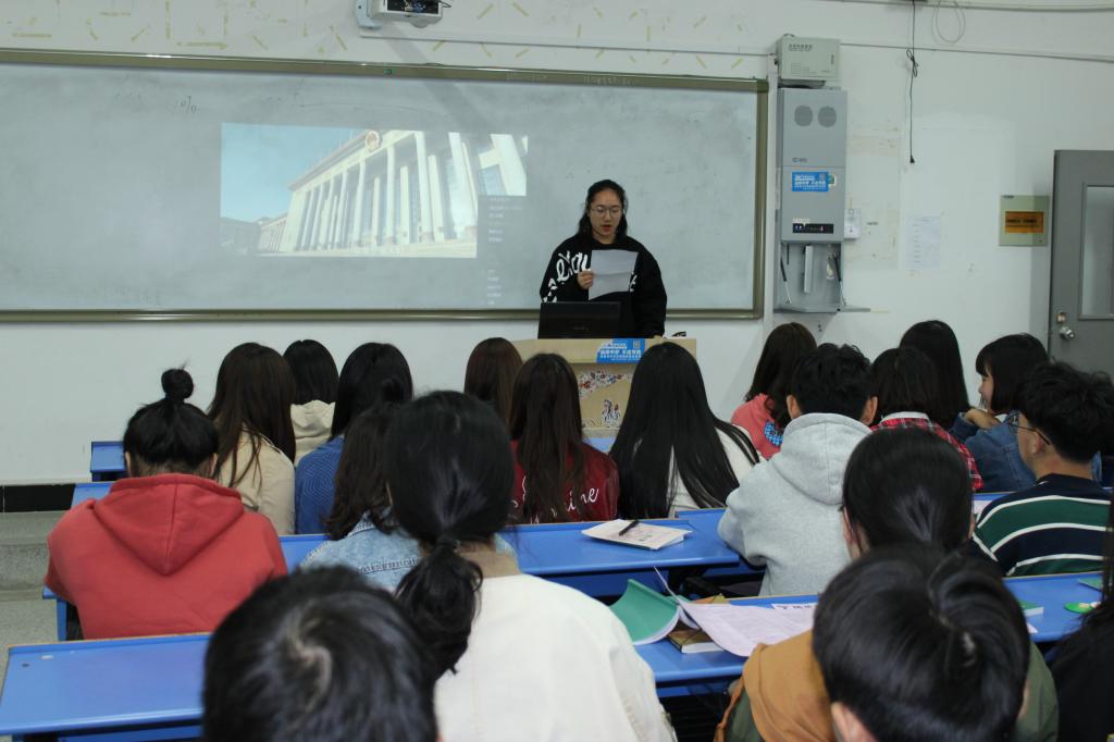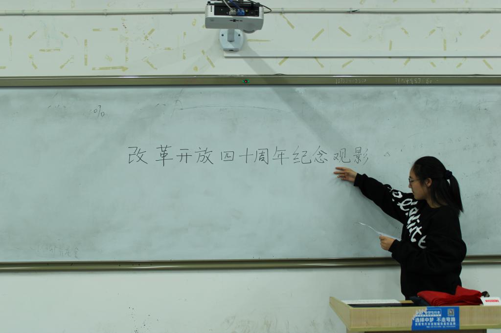 活动一开始,组织委员余雪在台上宣读改革开放的宣词,带领同学们了解改革开放的主要内容,以及改革开放的意义,并以影片的形式让大家了解,改革开放40周年以来,中国发生了哪些重大的改变,以及改革开放对我国未来的深远影响。