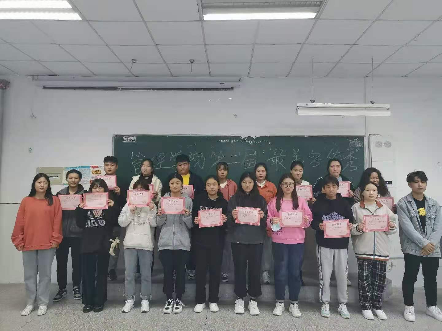 本次活动以投稿方式进行,用信纸或A4纸写一段文字,字体和内容不限,要求卷面整洁,无涂改痕迹。本次活动分别由学生会副主席陈建荣、学生会学习部部长刘东涵、宣传部部长汪学峰做评委,他们持着公平公正的态度对参赛作品进行打分。最终,20级旅游管理1班李忠望和20级财管1班陈宇晴荣获一等奖,获得二等奖的是20级会计4班卢双、20级旅管2班王梦缘、20级会计7班许天宇,20级财管2班罗延叶、20级会计7班王子瑞、20级会计8班黄晓峰、20级会计7班朱甜甜、20级财管2班李梦缘等获得了三等奖。还有优秀奖若干,最后三位评委为获奖人员颁奖。