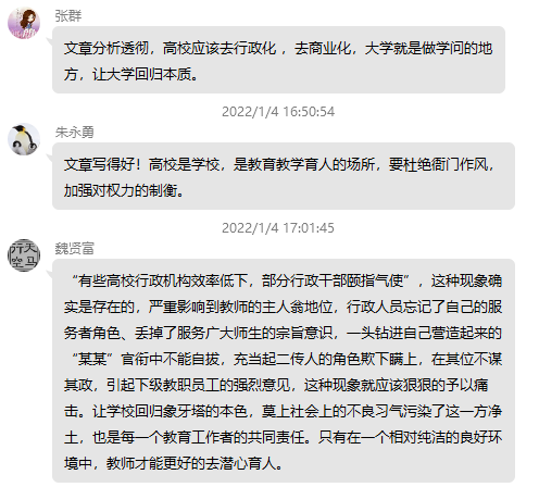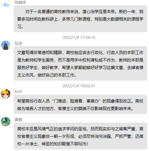 十九届中央第七轮巡视向教育部党组和31所中管高校党委进行巡视反馈,其中一半以上高校被指存在不同程度官僚主义问题。为了学习《纪委机关盘点高校官僚主义问题》的主题文章,2022年1月4日,财务会计系党支部线上召开全体党员大会。会前,支部书记赵进号召大家先进行线上学习和观看有关中纪委机关盘点的高校官僚主义现象的相关资料。会中,各位党员纷纷发言和交流,一方面大家指出了高校官僚主义、衙门做派的危害;另一方面,大家认为高校应力戒官僚主义和形式主义,存在问题的高校应去行政化、去官僚主义作风,还菁菁校园一片净土。