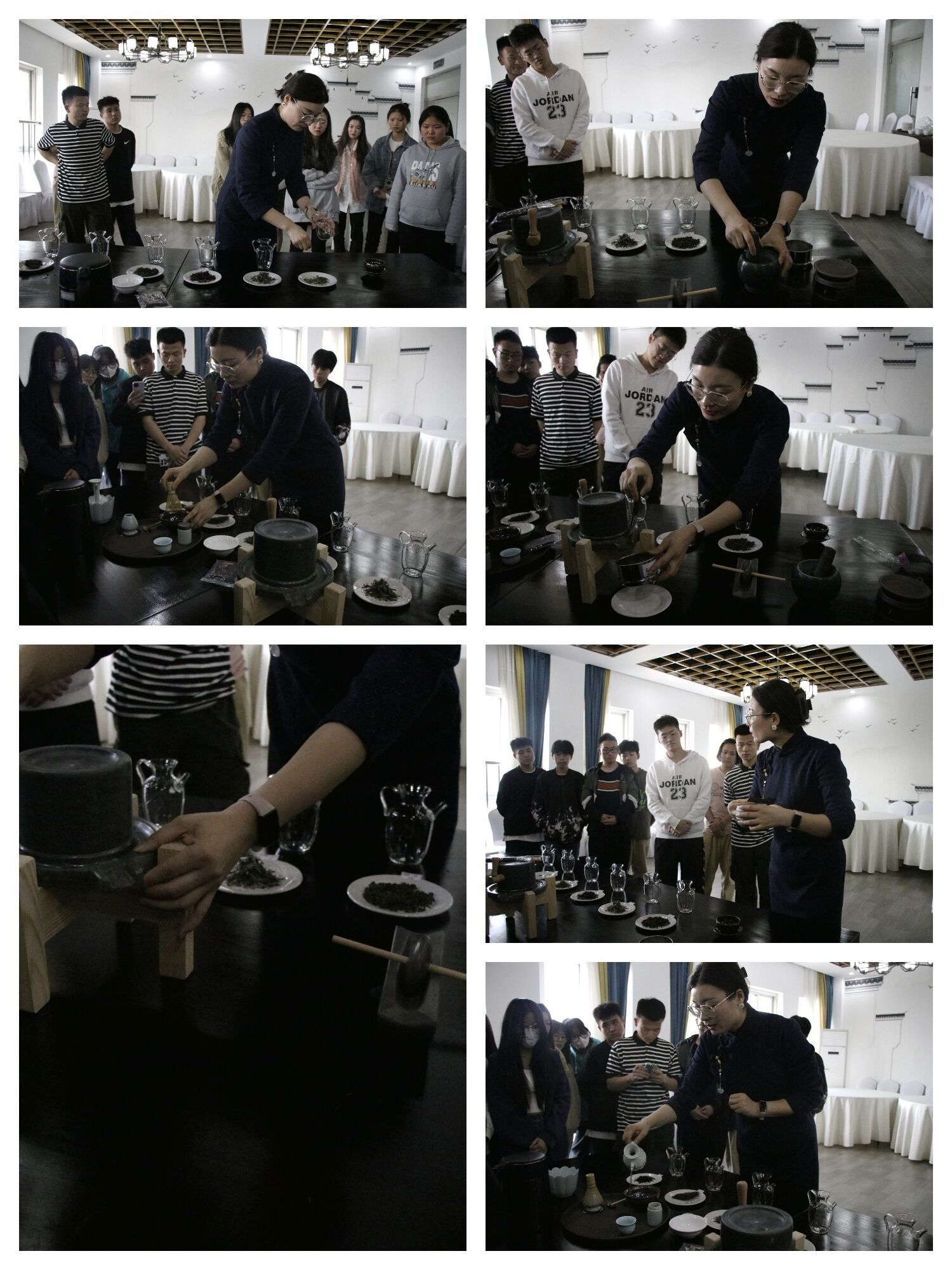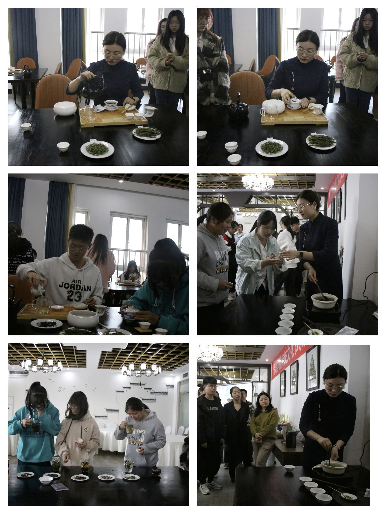 许老师先从中国茶文化的发展开始讲起,详细讲解了茶文化的起源与传播,人类通过沏茶 、赏茶、饮茶,增进友谊,学习礼仪。随后又亲自演示泡茶、煮茶的实践操作,茶香四溢,香如兰桂,让大家感受到清透、爽朗、愉悦。讲解结束,同学们都纷纷上前体验制茶、闻茶、品茶的快乐。