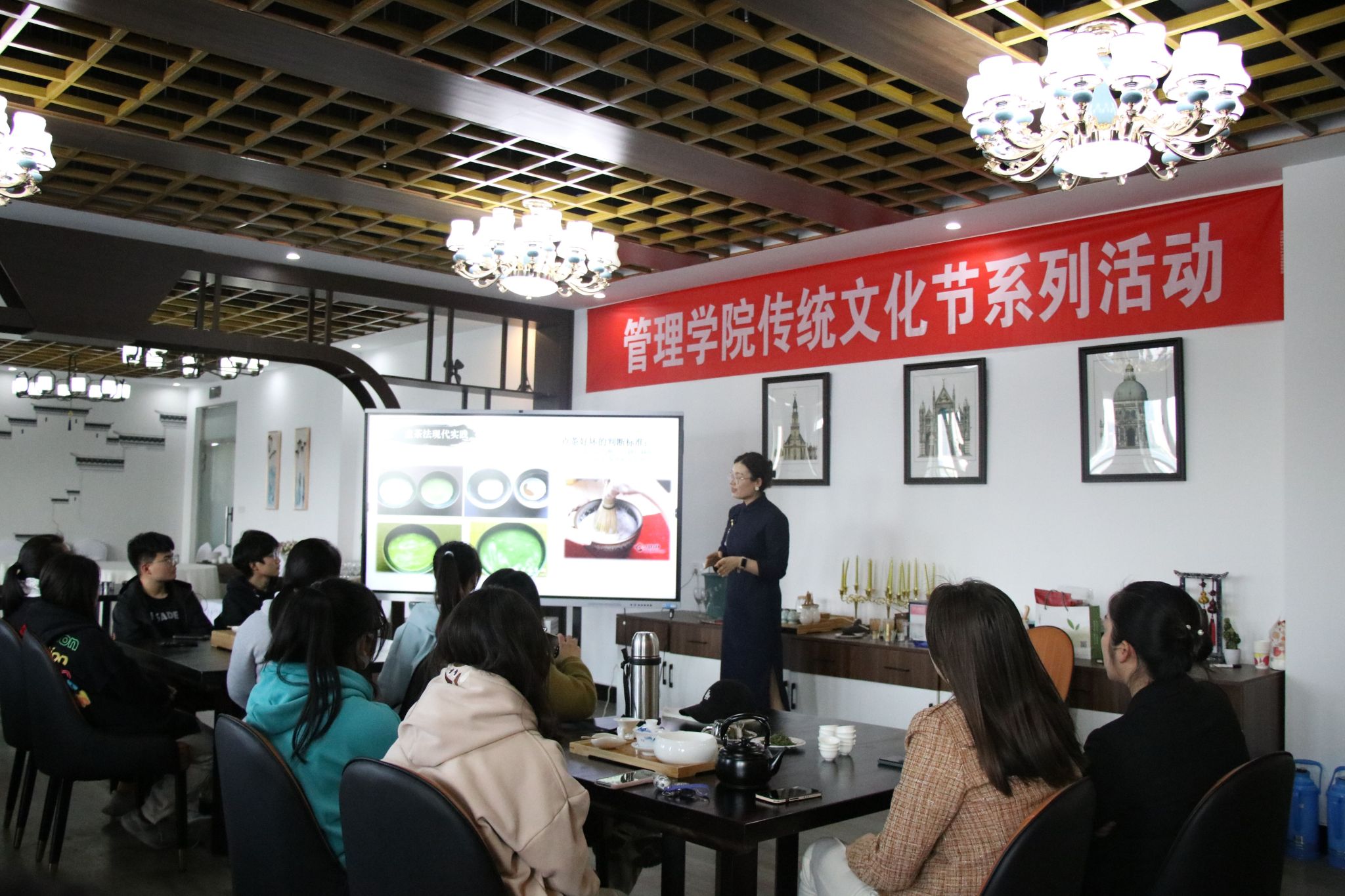 茶,是中华民族的举国之饮,茶文化是中华传统文化大观园中盛开的一朵“奇葩”,芬芳而甘醇。为弘扬中华优秀传统文化,引领茶文化走进校园,让更多的同学知茶、爱茶,共品茶香茶韵,共享美好生活。管理学院于2023年4月26日举办第一届传统文化节系列活动——茶文化讲座,本次讲座由许方媛老师主讲。