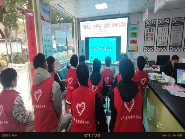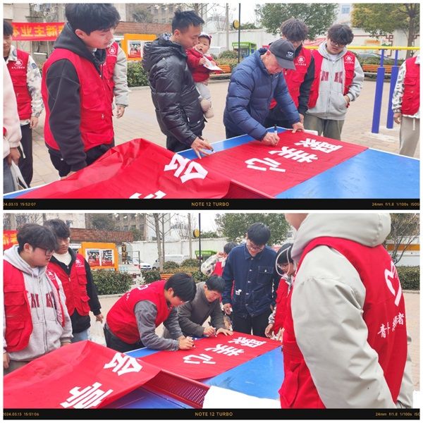 首先,志愿者在凤阳路社区进行垃圾分类视频教学,为下午的垃圾分类活动巩固知识储备。随后,我院志愿者们积极向社区居民发放学习雷锋精神的宣传手册,传播垃圾分类基本理念和方式方法,呼吁居民积极争当雷锋标兵,赓续雷锋精神。最后,组织社区居民在“聚美心、绘亭城,皖美社区我先行”横幅上进行签字,倡导社区居民做好社区环境保护、美化的责任与义务,为“皖美亭城”的建设与发展贡献蓬勃能量。