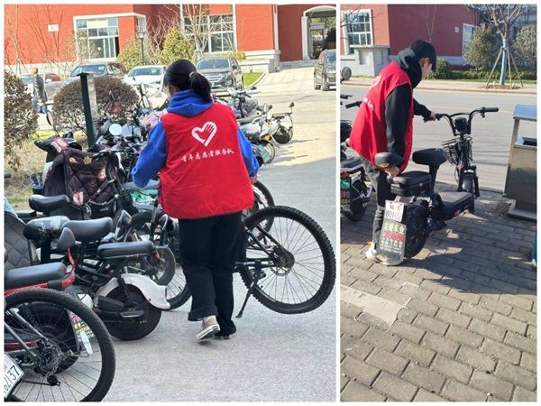 大家分工明确,有条不紊地展开清洁工作,有的手持夹子捡拾垃圾;有的挥舞扫帚,将落叶和尘埃聚集;有的戴上手套,将杂草清理;有的团队合作,将杂乱的电动车摆放整齐。他们不怕脏、不怕累,干劲十足,认真细致地将每个角落进行打扫,为营造干净整洁的校园环境增添了一抹耀眼的志愿“红”。
