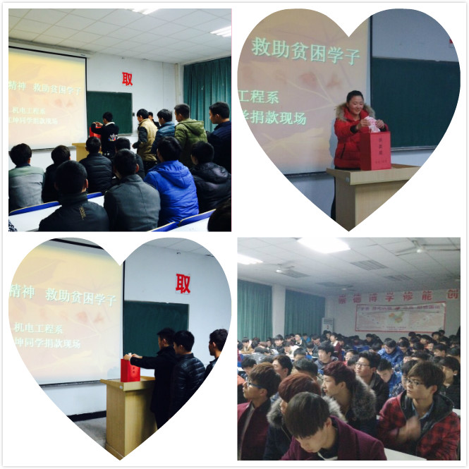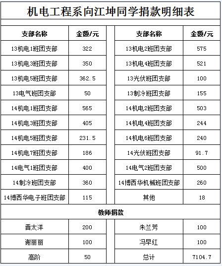 他叫江坤,是我们学校信息系的一名学生,在去年他被确诊为患有尿毒症,并且病情正在迅速加急。他的家庭环境不是很好,父亲早逝,母亲一个人将他们兄弟三个拉扯大。机电系师生得到这个消息后,在机电系团总支的组织和号召下,机电系全体师生发起了为身患重病的江坤同学献爱心捐款的活动。大家纷纷伸出了援助之手,慷慨解囊,奉献出了自己的一份爱心。你五十他一百,带着机电系师生满满的爱心与祝福纷纷投进了募捐箱,短短几天时间,机电系在校大一大二学生884人和教师共筹得善款7104.7元。机电系师生用实际行动传承雷锋精神,践行社会主义核心价值观。