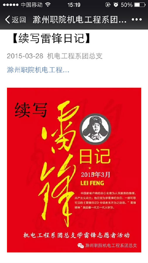 雷锋叔叔一生行好事无数,但不幸英年早逝。机电系团总支在学习雷锋月期间,积极倡导全系同学把雷锋精神进行到底,利用微信把同学们的好人好事行为记录在雷锋日记中。将雷锋日记永远的写下去。