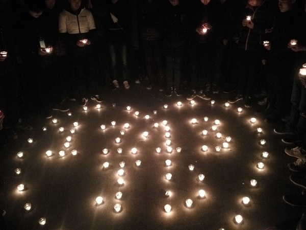 观看爱国电影之后,同学们到机电系大厅,用蜡烛摆成心形代表着我们华夏儿女共同一心,里面用蜡烛摆了四个醒目的阿拉伯数字12•13,周围围满了同学,同学们手里捧着燃烧的蜡烛默默的哀悼79年前遇难的同胞们。