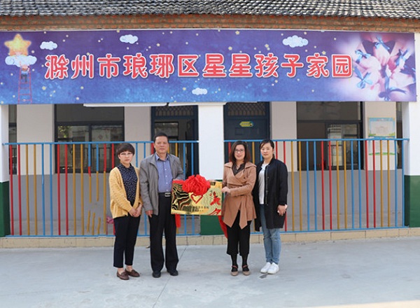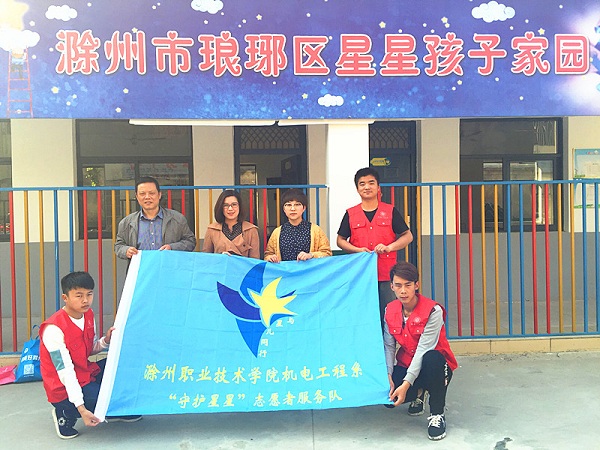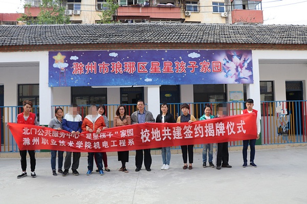 为了进一步弘扬志愿者精神,深入贯彻“一学一做”教育实践活动,鼓励团学青年积极投身志愿服务队伍,2017年4月27日下午,由机电系团总支与滁州市琅琊区星星孩子家园校地结对共建的“大学生志愿服务基地”正式落户星星孩子家园内。机电系党总支书记晋太洋、团总支书记张文、滁州市琅琊区星星孩子家园负责人徐书记以及“守护星星”志愿服务队负责人共同见证了本次签约揭牌仪式。