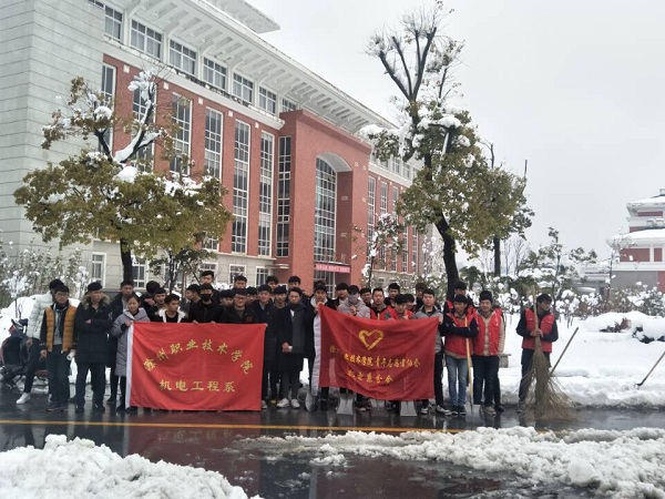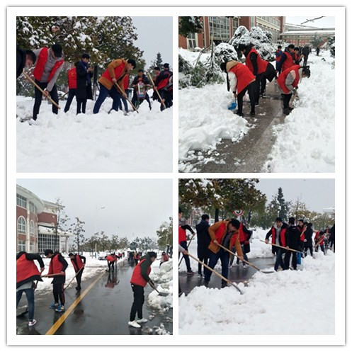 冬月至,雪乱舞,为了方便学院师生出行,保障行车安全,2017年1月5日,在院团委的组织下机电系志愿者们积极开展义务扫雪除冰。