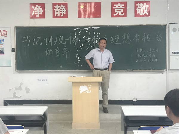 6月20号中午11点40,机电系在5103教室开展书记讲规,主题为“做一个有理想有担当的青年”。由我系党总支书记晋太洋主讲,我系全体团学干参加。