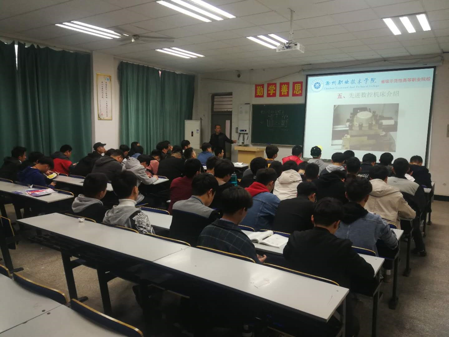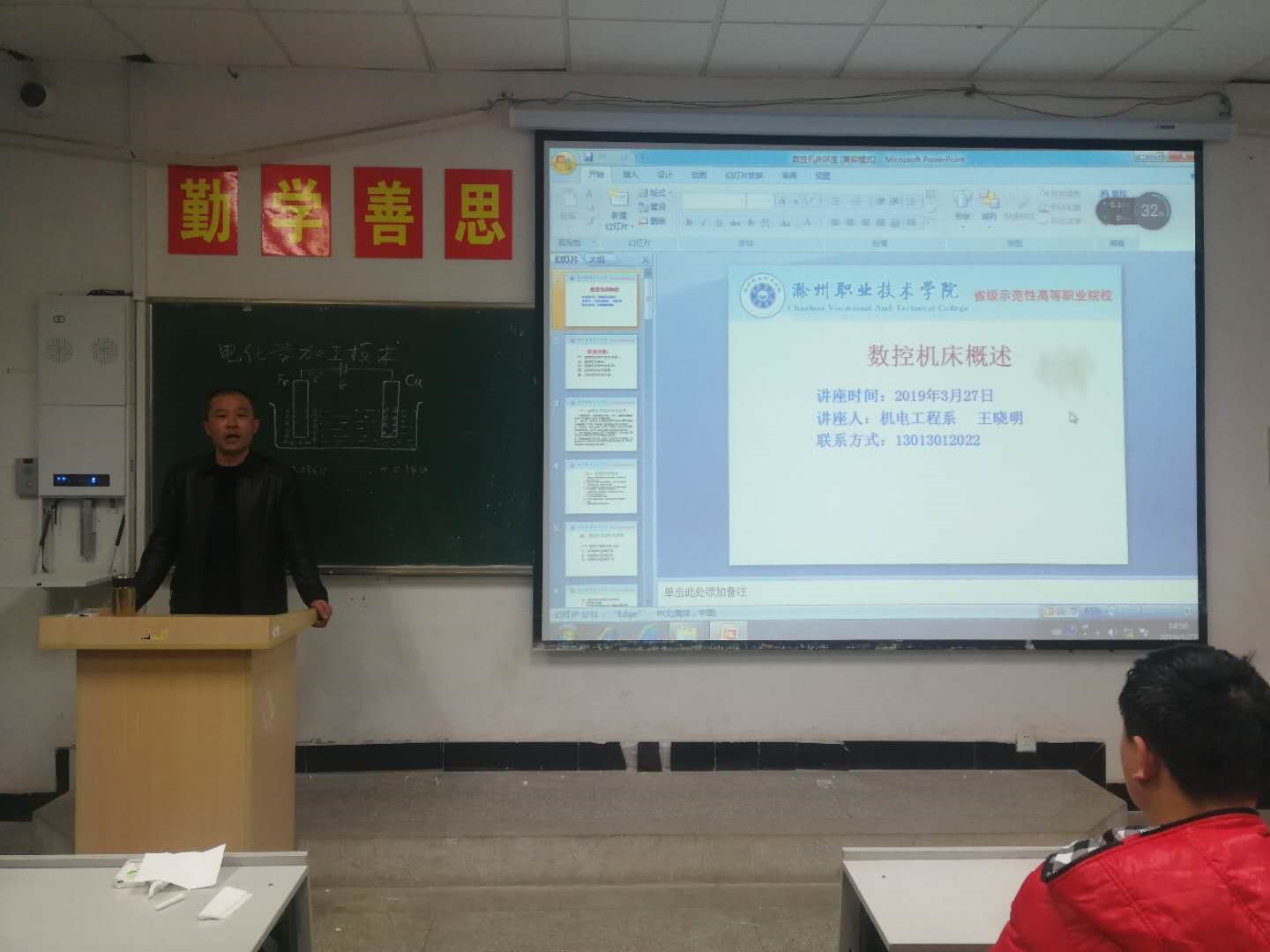 2019年3月27日下午14点,机电工程系副教授王晓明老师在5102教室举办“数控机床概述”专题讲座,参加本次讲座的有机电一体化教研室主任孙义婷及各相关专业教师、2017级机电一体化专业部分学生。王教授全面、系统的讲解数控机床的产生与发展、数控机床特点、数控机床结构与类型、数控机床工作原理和先进数控机床。大家都认真学习,对于目前《数控加工与编程》课程的学习将有很大的帮助。