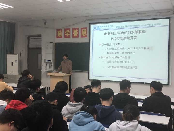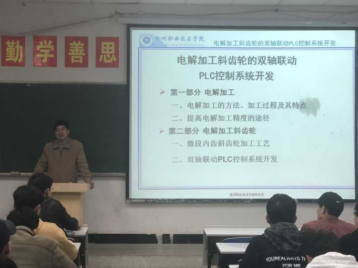 2019年4月10日,机电系杨思国主任在5103多媒体教室举办学术讲座。讲座的题目是:电解加工斜齿轮的双轴联动PLC控制系统开发。讲座围绕电解加工的方法、加工过程及其特点,提高电解加工精度的途径,微段内齿斜齿轮加工工艺,双轴联动PLC控制系统开发等四个方面内容进行介绍和分析。参加的同学普遍表示讲座丰富了专业知识,拓展了知识面,对自身今后的发展和定位有积极的影响。