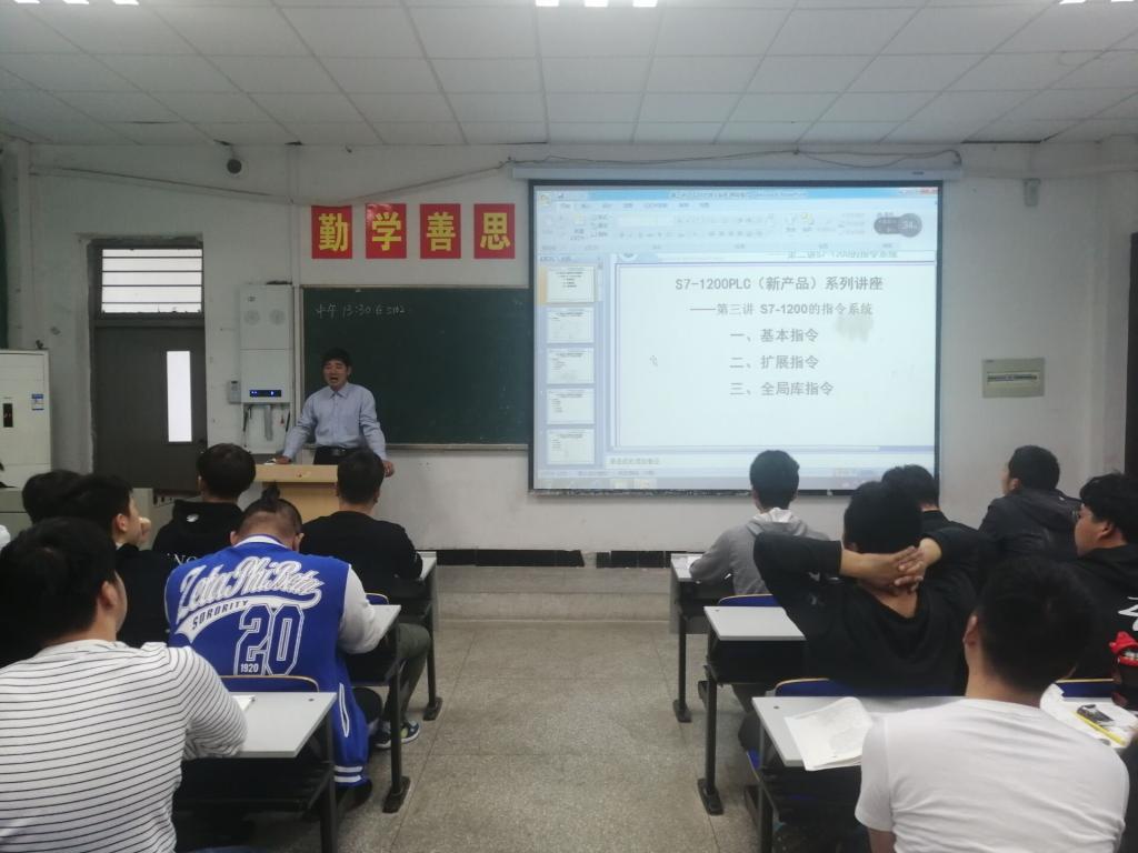 2019年5月8日,机电系杨思国主任在7N308教室举办学术讲座。讲座的题目是:S7-1200(新产品)系列讲座——第三讲S7-1200的指令系统。讲座全面介绍S7-1200PLC的基本指令、扩展指令和、全局库指令。与会师生表示通过S7-1200(新产品)系列讲座共三讲,较全面地了解S7-1200PLC这一工业控制领域的新产品,同学位对下学期学好这门课充满信心和期待。