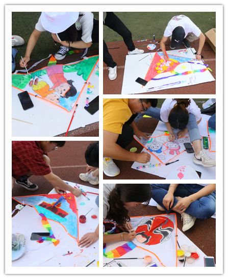 在主持人介绍完比赛规则后,每组参赛人员领取了比赛用品,围着风筝坐成一圈,大家发散思维,用画笔在风筝上绘出对祖国的热爱。从五星红旗、天安门、长城到母爱、脸谱、青春记忆,都充分体现了新时代新青年的风采,他们用这种方式表达了自己心目中的祖国。最终经过评定,机电系和食环系参赛队获得本次比赛一等奖。