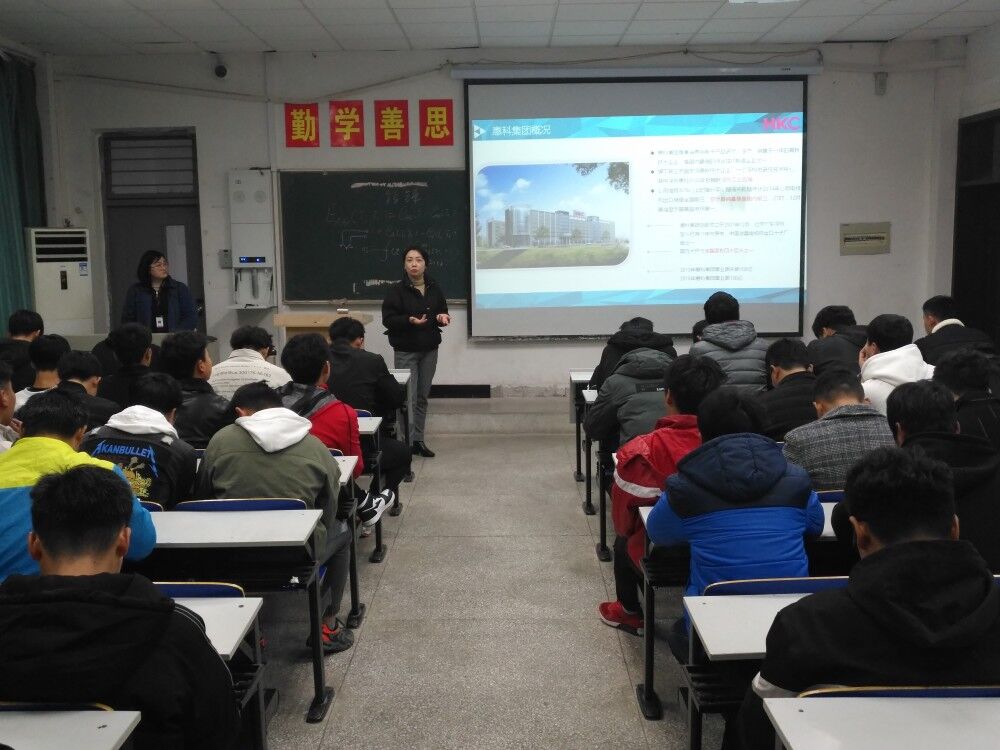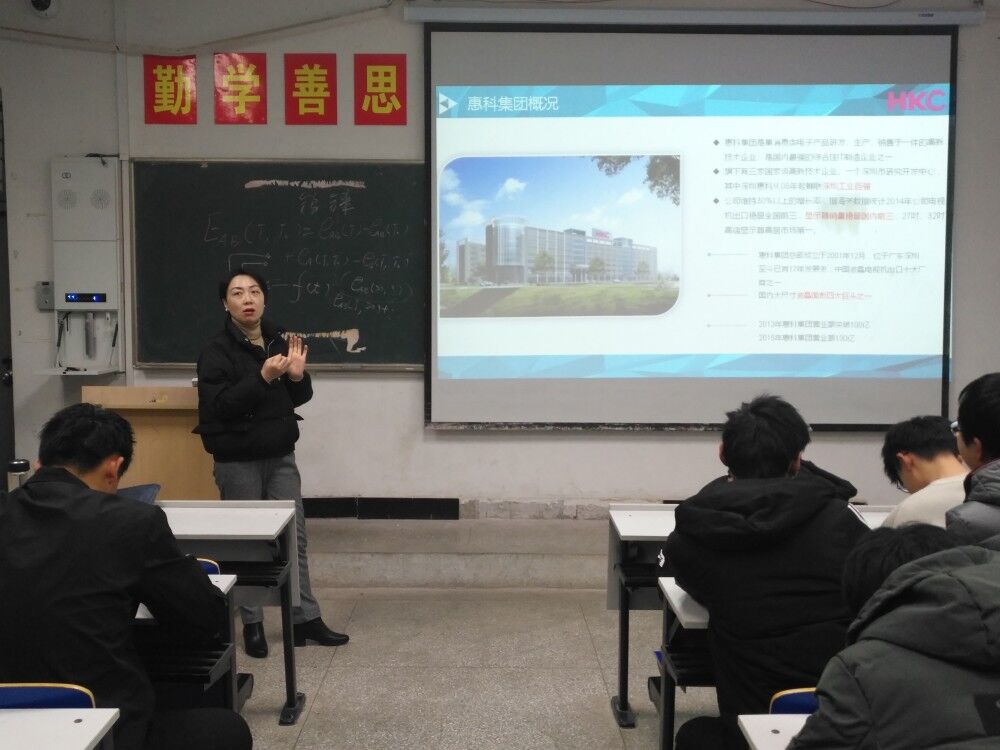 为深入贯彻落实《国家职业教育改革实施方案》,积极推进现代学徒制工作,2019年7月学校与惠科光电科技(滁州)有限公司签订了现代学徒制校企合作协议。前期电气工程学院和惠科公司共同制定了“惠科班”人才培养方案,按企业岗位需求建立了促进学徒“岗位成才”的课程体系。为更好的推进“惠科班”校企共建,落实“双主体”育人工作,应电气工程学院燕相松副院长邀请,2019年11月27日惠科光电科技(滁州)有限公司人力资源部经理张海燕到校为“惠科班”及2019机电专业的全体同学做了校企合作专题报告。