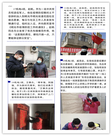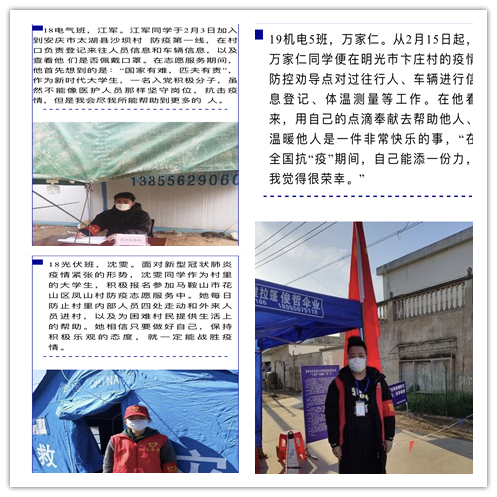 主持人首先向大家介绍了本次活动的意义及流程,随后由我院6名志愿者讲述青春战“疫”故事。在疫情最严重的时候他们选择“逆行”,在抗疫一线将遏制疫情扩散的责任担在肩上,主动到疫情防控一线工作,用实际行动扛起了抗“疫”使命担当,充分发挥了共青团员的模范带头作用,弘扬青春正能量。最后参加活动的团学青年也表达了自己的想法,要向榜样力量学习,担负起时代赋予的使命。