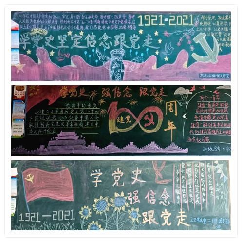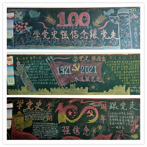 各团支部紧扣图“学党史、强信念、跟党走”主题,用心构思、精心选材,齐心协力创作了图文并茂、内容丰富的党史学习教育黑板报。在我院师生中形成了“随时能看到、随时能想到、人人能学到”的浓厚党史学习氛围。