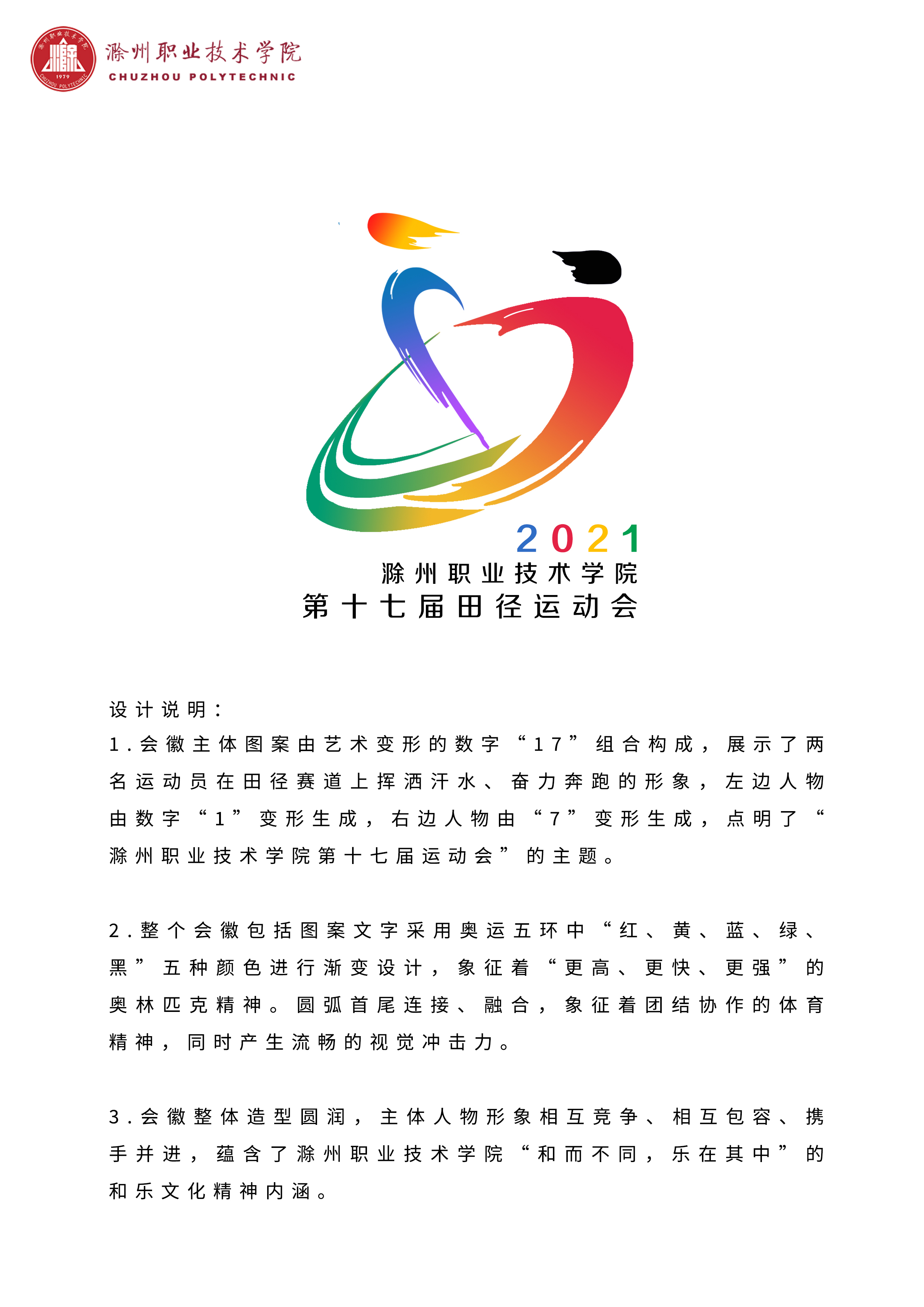 由金沙威尼斯欢乐娱人城主办,传媒与设计学院承办的2021年金沙威尼斯欢乐娱人城第十七届田径运动会会徽征集活动,自4月7日公告发布以来,吸引了全校师生的踊跃报名参赛。比赛截止到4月20日,经院部汇总、初审,校领导综合评审,最终共评选出6件入围作品,分别获得一、二、三等奖。现将获奖作品公告如下: