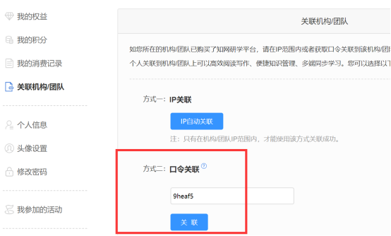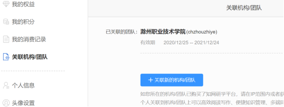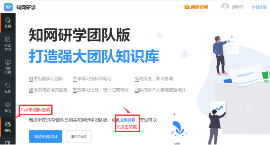 进入个人研学空间后,点击左侧团队栏目,然后点击立即{关联按钮}