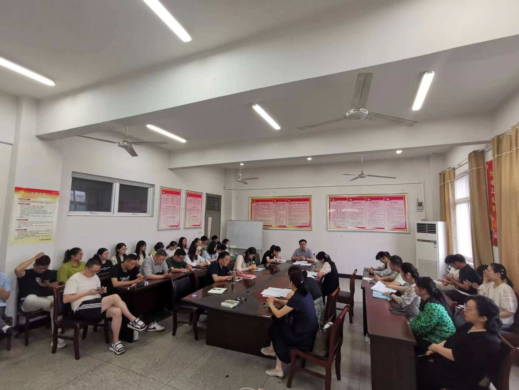 李晓辕副书记带领教职工深入学习《在全校开展“思想大解放、环境大优化、能力大提升、作风大转变、任务大落实”大学习、大讨论、大调研的工作方案》文件内容,领会文件精神,进一步解放思想、转变观念,凝聚共识、汇聚力量。