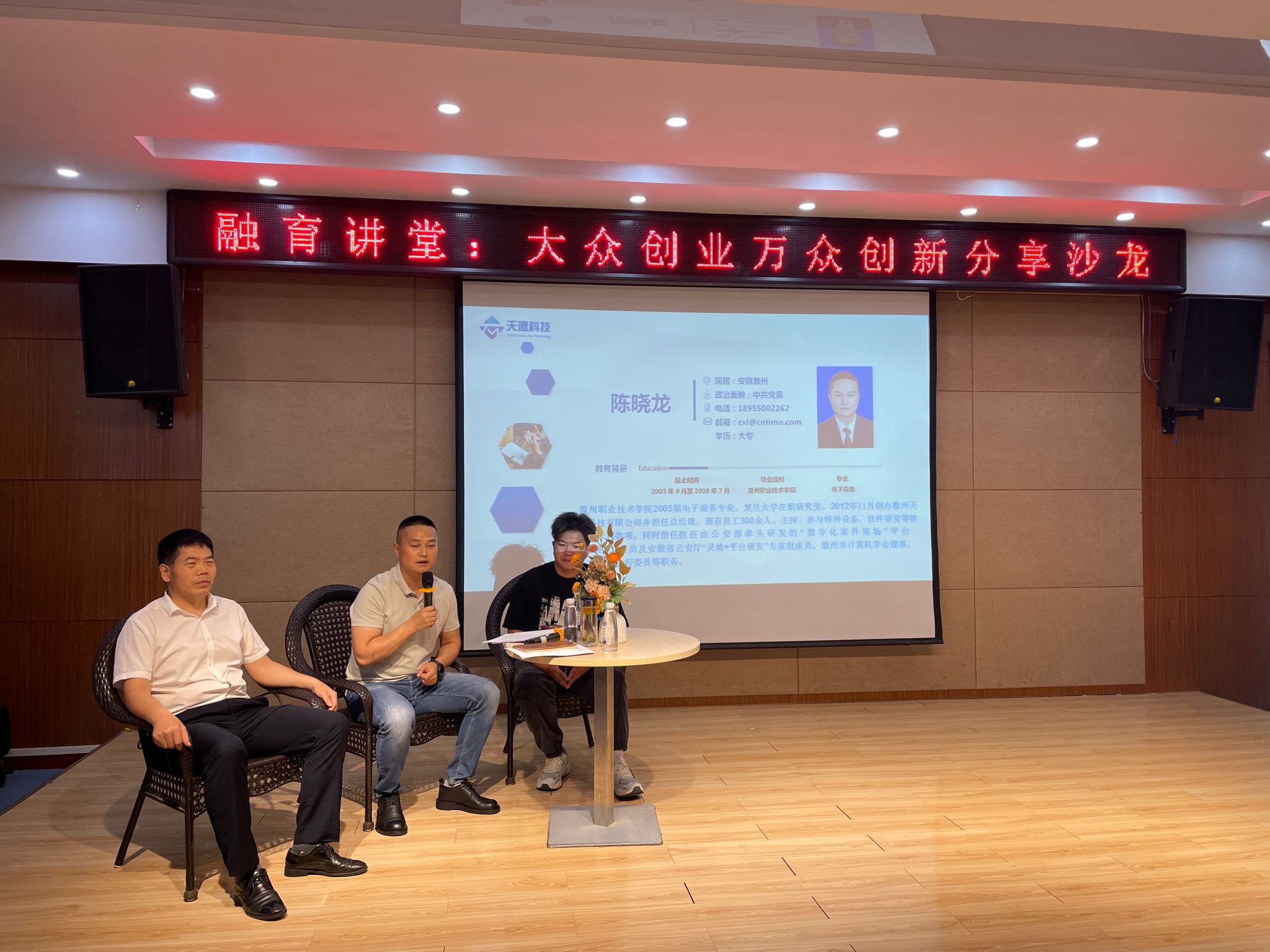 活动开始,由陈晓龙首先分享创业初衷及艰辛的创业历程,将一个几人的小公司发展成为如今滁州市的代表企业——滁州天邈电子科技有限公司,同时,陈晓龙也分享了一些对待生活的态度和做事的原则,让在场学生收获满满。李忠杰作为年青一代的创业者也分享了一些在创业初期的故事,贴近生活又令人动容,简短而丰富。在交流会的最后,周多道总结了两位校友发言,同时也勉励在座各位同学努力学习增长自身才干,拿出敢闯敢拼的精神,走出一条大众创业万众创新的康庄大道。