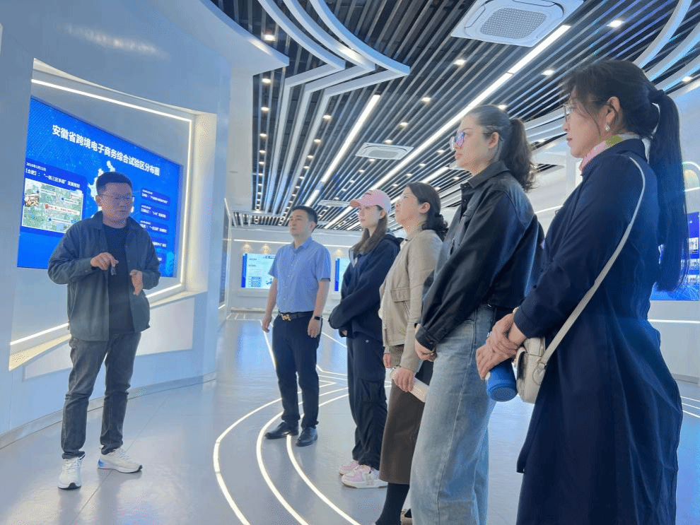 许正环一行依次参观了中心的多功能展厅、跨境企业生态展示区及人才实训中心。在多功能展厅,通过产业地图、政策解读展板及标杆企业案例墙,教师们系统了解了安徽省跨境电商发展态势、政府扶持体系及“产业带+跨境”的本地化实践路径。