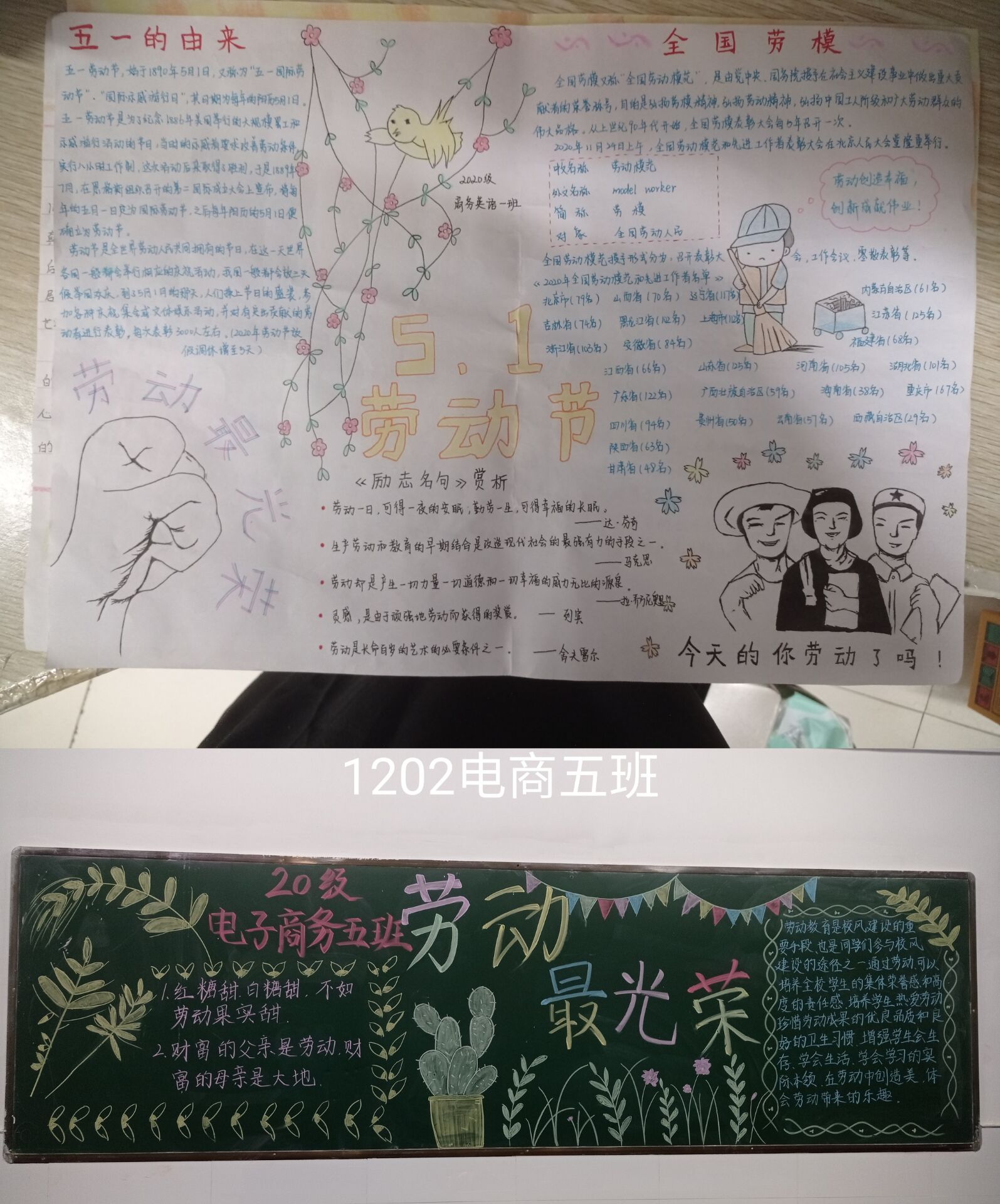 各班级均积极参与此次评比活动,同学们耐心收集资料,精心设计版面,以板报这个小小载体来表达自己对劳动理念的认识,以实际行动弘扬中华劳动文化。经过学生会的认真评比,20级电商5班荣获一等奖, 20级商英1班和电商4班获得二等奖,获得三等奖的是20级商英3班、电商3班和市营2班。
