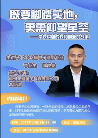 青春和创业同行,为贯彻落实党的二十大精神,深化就业创业工作,商学院于2022年11月16日下午在南阶203教室开展优秀毕业生创业分享会。主讲人是2008届电子商务专业毕业生陈晓龙,现任职滁州天邈电子科技有限公司总经理。