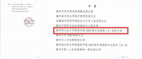 近日,共青团滁州市委公布了2022年度滁州市五四红旗团(工)委、滁州市五四红旗团(总)支部、滁州市优秀共青团员、滁州市优秀共青团干部评选结果,我院20市场营销2班团支部荣获“滁州市五四红旗团支部”荣誉称号。