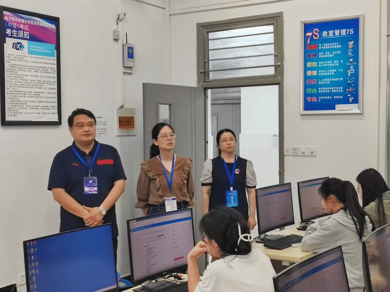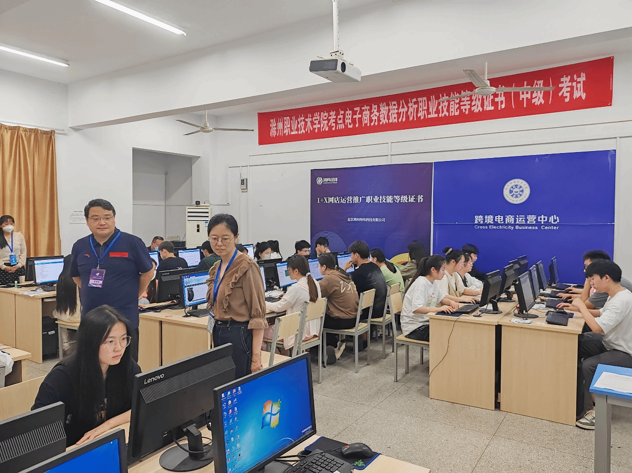 为贯彻落实《国家职业教育改革实施方案》中“1+X”证书制度试点工作的要求,加快推进金沙威尼斯官网课证融通教学改革实践。根据考务工作安排,2023年5月27日,商学院在致真楼1228、1231机房举行了“1+X”电子商务数据分析职业技能等级证书(中级)考试。商学院党总支副书记李晓辕、商学院副院长许正环、滁州城市职业学院管理学院书记陈兴旺到现场指导工作。商学院电子商务专业共80名学生参加本次认证考试。