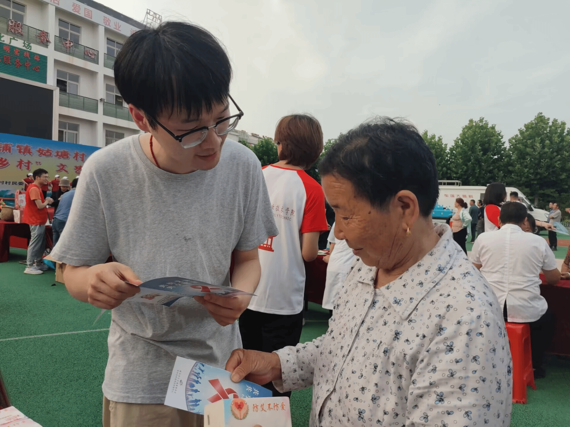 活动开始时,实践团成员通过摆放展板、发放宣传、送抽纸、展示艾滋病发病之后的图片、案例、宣传海报等方式,向村民们介绍艾滋病的病因、危害以及如何进行防治等方面的知识,让村民们知道养成良好的健康生活习惯的重要性。