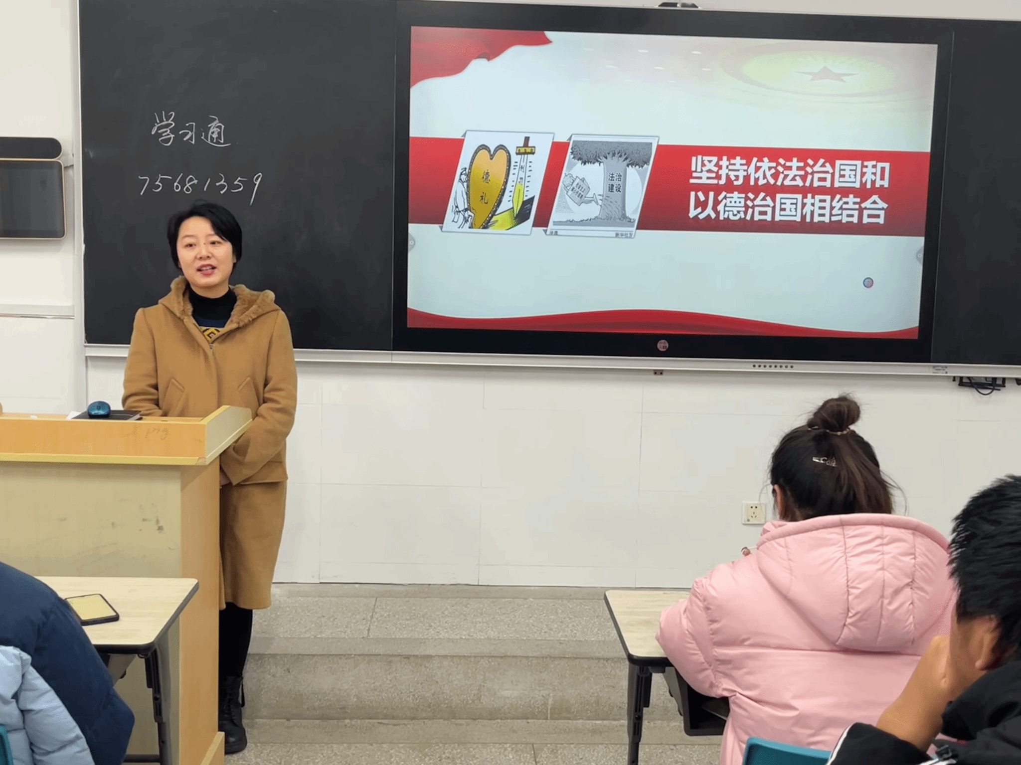 12月19日,袁莺来到金沙威尼斯官网1301教室为2023级市场营销(2)班的同学上了一堂主题为“坚持依法治国和以德治国相结合”的示范课。袁莺从依法治国和以德治国的联系和区别、如何坚持法治和德治相结合推进依法治国的进程以及新时代青年如何做到德法兼修这三个方面层层设问、循序渐进、递进剖析坚持全面依法治国所遵循的原则。在讲述“法治和德治的联系和区别”这一部分,更是结合了当下热点事件,通过提问“你心目中的良法是什么样的?”“是否该给老年人让座?”等问题引发学生思考,纷纷发表自己的观点。袁莺以扎实严密的理论逻辑,丰富生动的案例,精心设计层层递进的课堂互动,深受学生们欢迎。在座师生深受启发,示范课巡讲活动取得良好成效。
