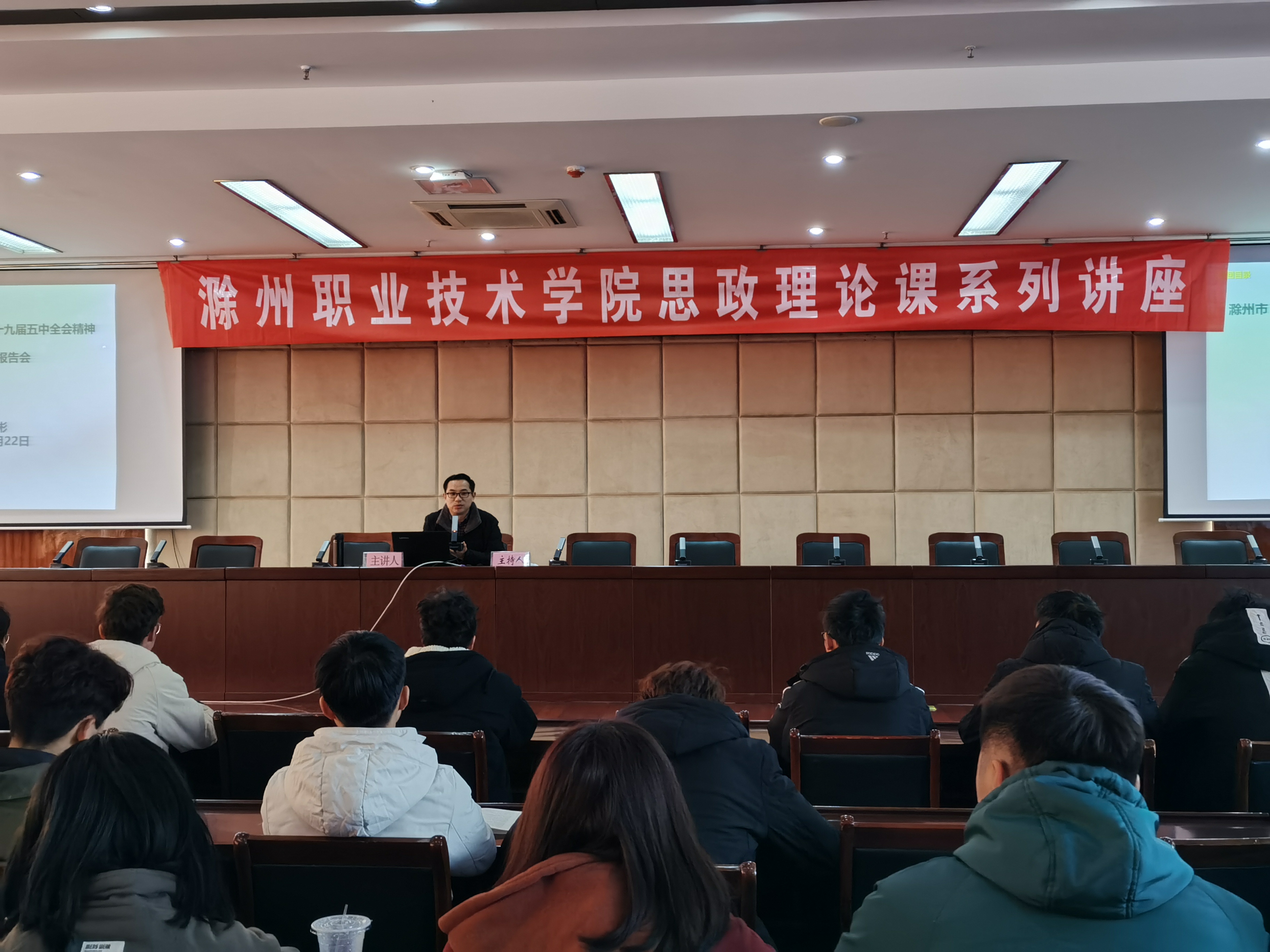 讲座重点围绕党的十九届五中全会召开的重大意义、全会审议通过《建议》的主要内容、滁州市落实全会精神的具体举措展开阐述,使同学们明确这次全会是我们党在全面建成小康社会胜利在望、全面建设社会主义现代化国家新征程即将开启的重要历史时刻召开的一次十分重要的会议,是在我国将进入新发展阶段、实现中华民族伟大复兴正处于关键时期召开的一次具有全局性、历史性意义的会议,畅谈了“十三五”以来滁州市主要经济指标持续高于全国全省平均水平,经济总量先后突破2千亿元和3千亿元大关,年均增长8.2%,高于全省1个百分点。预计2020年实现地区生产总值3100亿元,跃居全省第3位、长三角城市第24位,人均GDP突破1万美元。累计完成13.5万贫困人口稳定脱贫、123个贫困村出列、省级贫困县定远县顺利摘帽,贫困发生率从3.75%降至0%,脱贫攻坚目标全面完成。同时也提醒同学们一方面要看到我国发展总体态势是好的,我们完全有基础、有条件、有能力取得新的伟大胜利,也要看到当前诸多矛盾叠加、风险挑战显著增多,我国发展面临着前所未有的复杂环境。另一方面。也要坚持正确的历史观、大局观、发展观,看清当前国际国内形势纷繁复杂现象下的本质,做到临危不乱、危中寻机、开拓进取、开辟新局,更好统筹中华民族伟大复兴战略全局和世界百年未有之大变局。希望同学们放飞青春梦、奋进新征程,用实际行动引导青年学生把实现自身价值与服务祖国人民相统一,把树立远大理想与进行艰苦奋斗相统一,坚定制度自信,争做堪当民族复兴大任的时代新人。