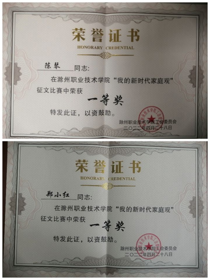 陈琴老师的《百合花开》、郑小红老师的《意外快递》在工会组织的“我的新时代家庭观”征文比赛中获得一等奖。