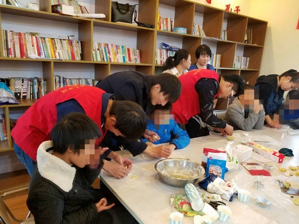 刚到达星星家园时,孩子们虽然有着很强的戒备之心,不愿搭理志愿者们,但志愿者还是主动去与他们找话题交流沟通。爱心志愿活动中,一部分志愿者在学长的带领下去搬运爱心人士捐献的物品,另一部分志愿者去陪孩子们做饼干,在做饼干时,孩子们开始慢慢接纳志愿者。他们一起揉面粉,一起做各种形状的饼干。虽然他们不能用语言表达他们的情感,但志愿者知道他们是快乐的,是愿意与自己交流的。饼干烤好了,甜甜的香味漫布了他们的世界。志愿者在孩子们吃饼干时,早早地把温的水放在一旁,等待孩子去喝。吃完后,他们一起去画画,看动画片。尽管他们的画对于我们来说或许抽象,但这是星星们的语言、情感的表达。之后,志愿者们同孩子们一起去玩体育器材,与他们一起去拍球,与他们一起幼稚,一起欢笑,笑声打破界线,志愿者们进入了孩子们的世界。