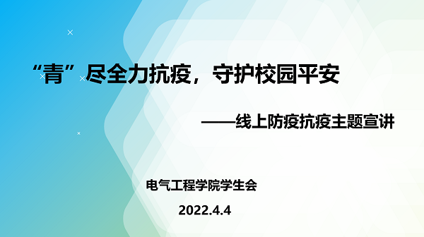 为积极配合学校实施静态管理,电气工程学院学生会于4月4日晚,组织20、21级青年学生代表通过腾讯会议开展“青”尽全力抗疫,守护校园平安——线上防疫抗疫宣讲教育。