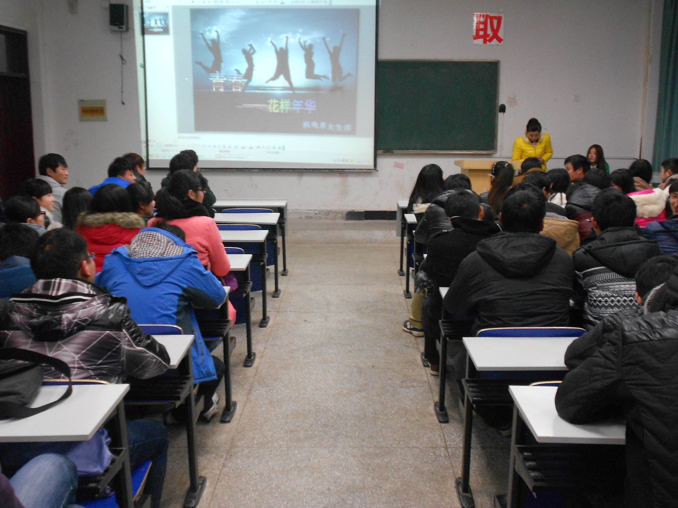 青春是人生一道洒满阳光的风景, 是一首用热情和智慧唱响的赞歌。为了迎接女生节的到来,机电系于2014年3月3日晚上7点在5103教室开展了女生节“青春花样年华”主题活动。此次活动由我系女生部主办,各部部长和大一部分学生代表参加此次活动。